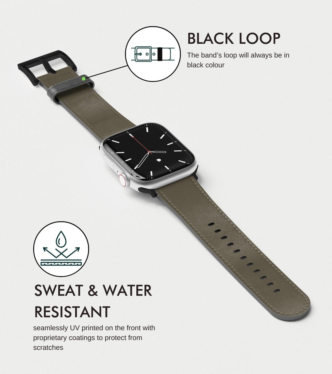 Whereas our vegan leather Apple watchbands are printed using a special cold UV Printing technique which results in subtle matte leather finish.