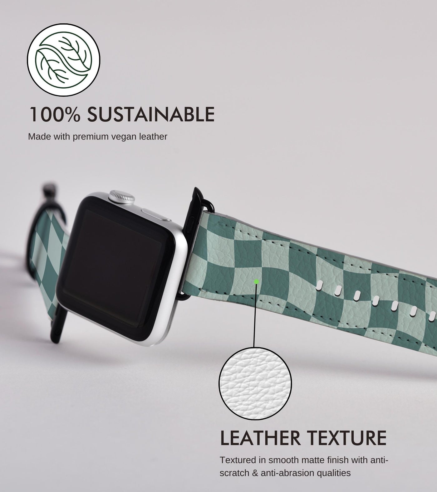 Whereas our vegan leather Apple watchbands are printed using a special cold UV Printing technique which results in subtle matte leather finish.
