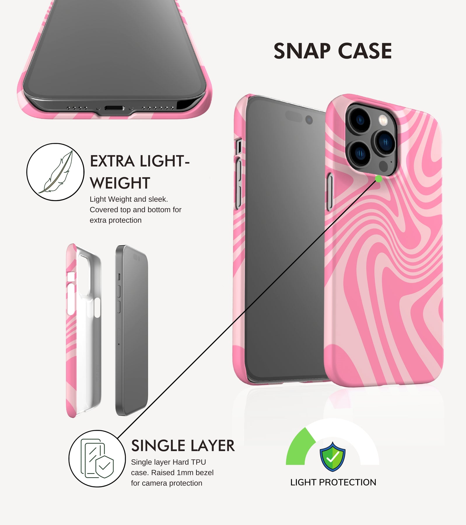 Snap Cases: Our Snap cases are ideal for keeping your phone safe from daily wear and tear including small knocks and drops while staying slim, chic, and lightweight. It also has raised bezel for screen protection. Therefore, if you are not clumsy, don’t drop the phone often, and like a slim cute case, the snap case is made for you.