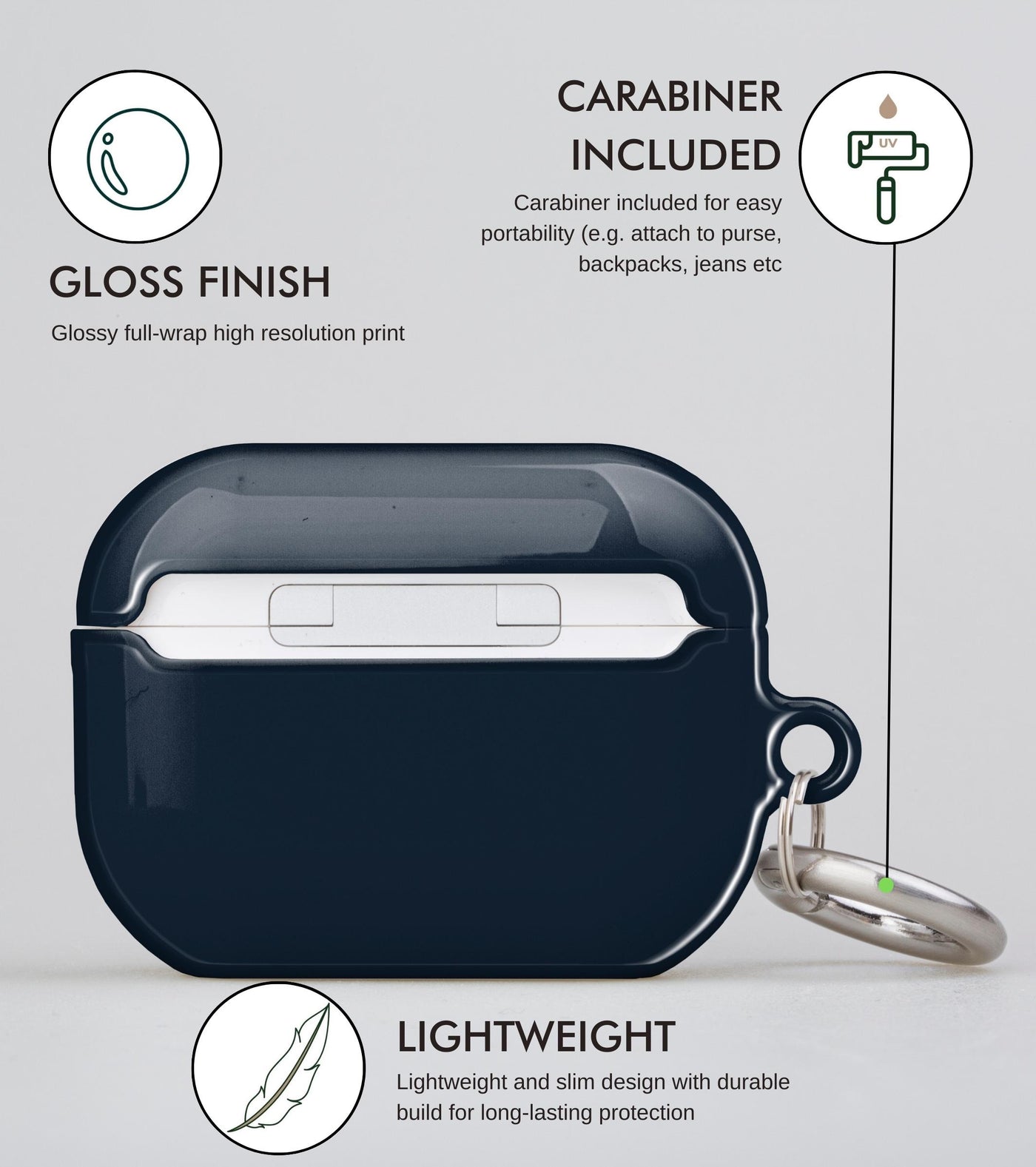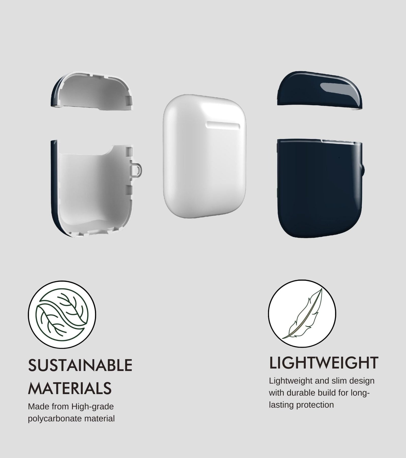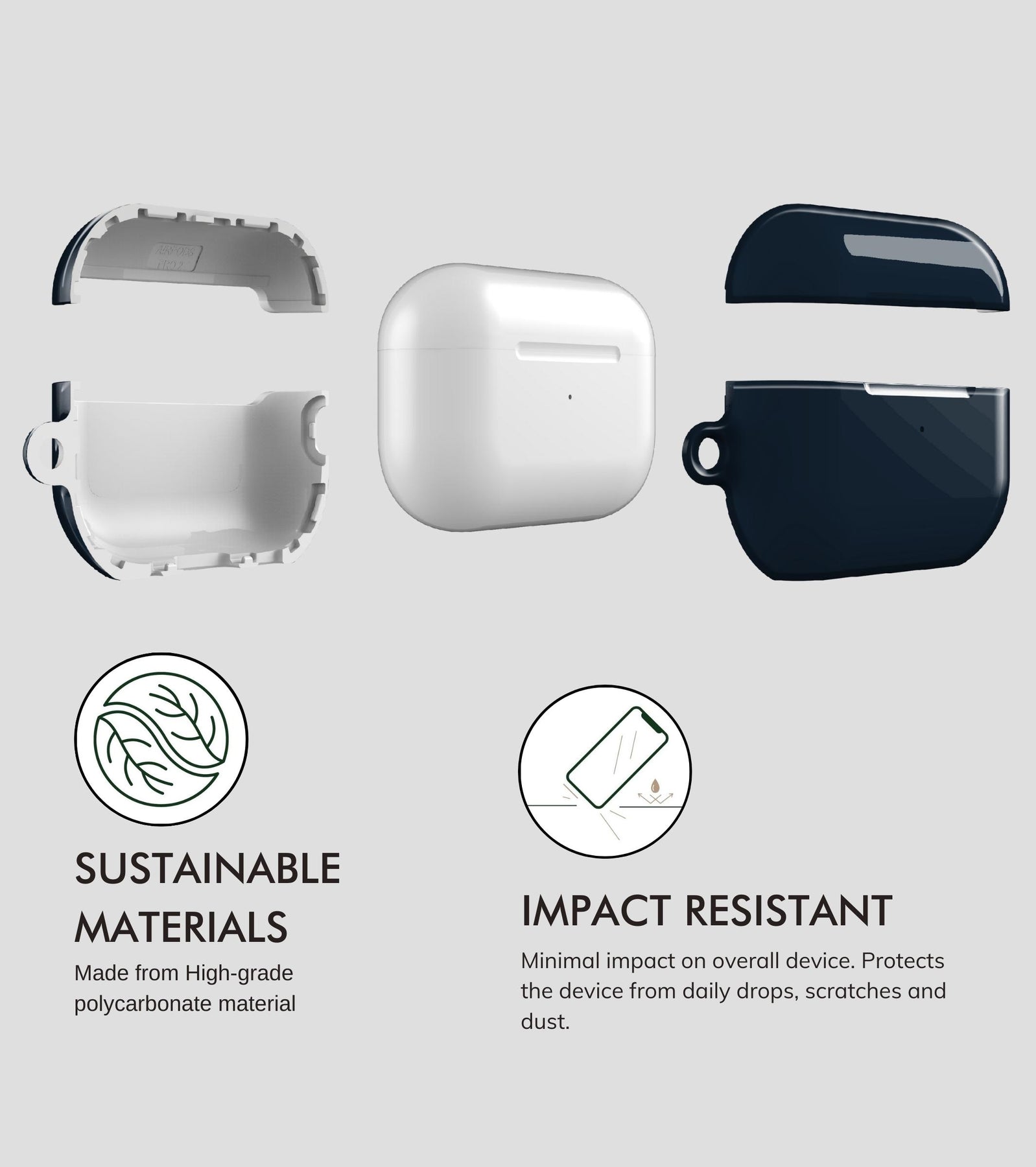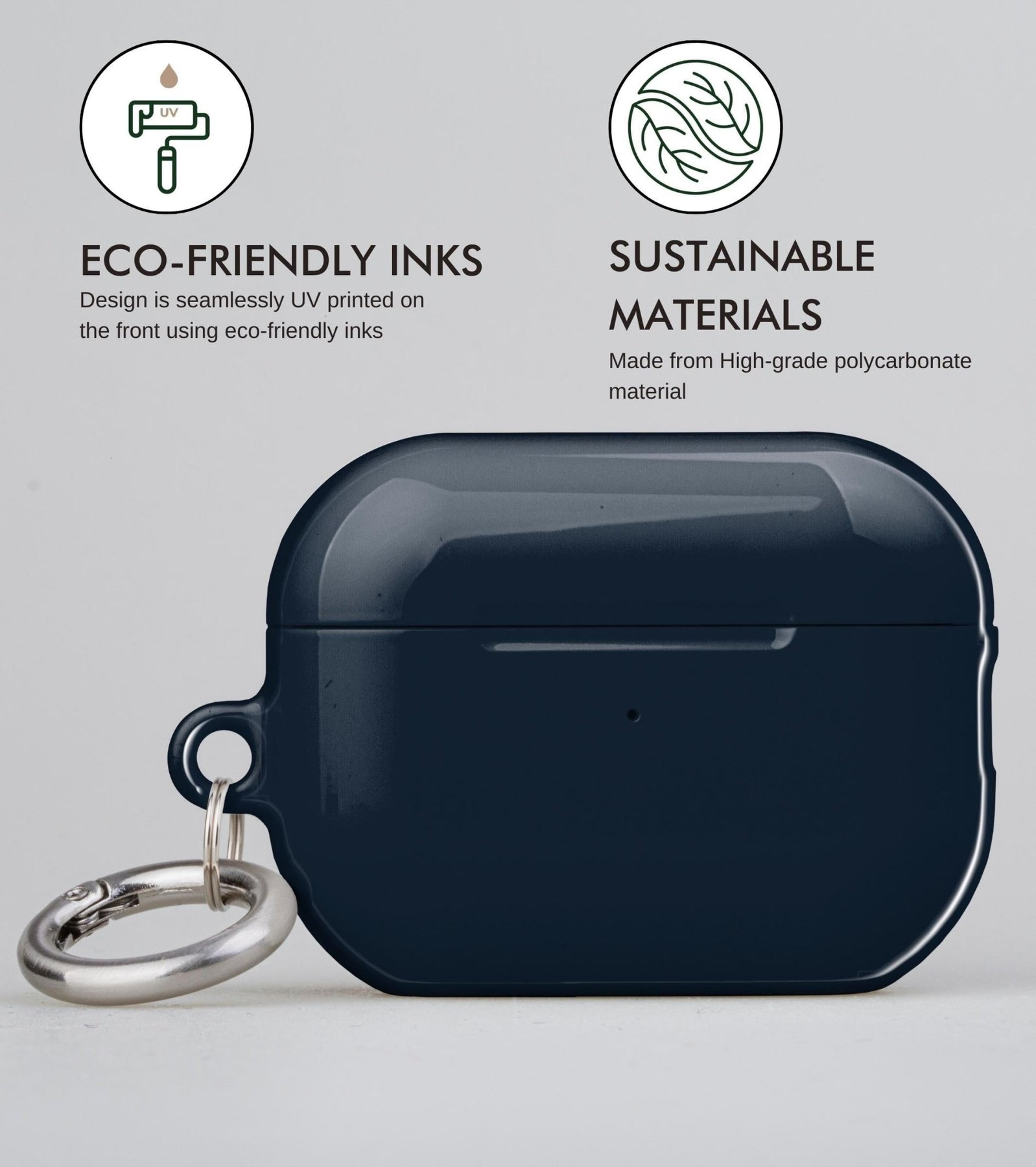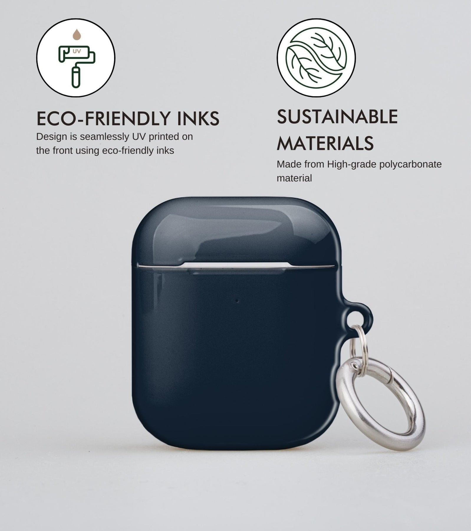 Polycarbonate (PC) – Polycarbonate is used for our AirPods cases and AirPods Pro cases. We prefer this premium material because it provides superior protection to your AirPods.