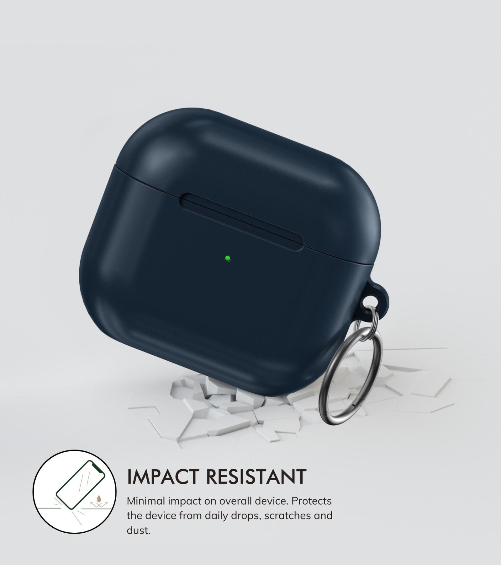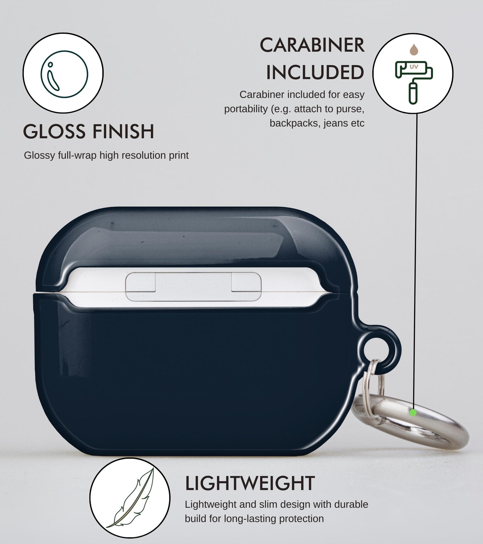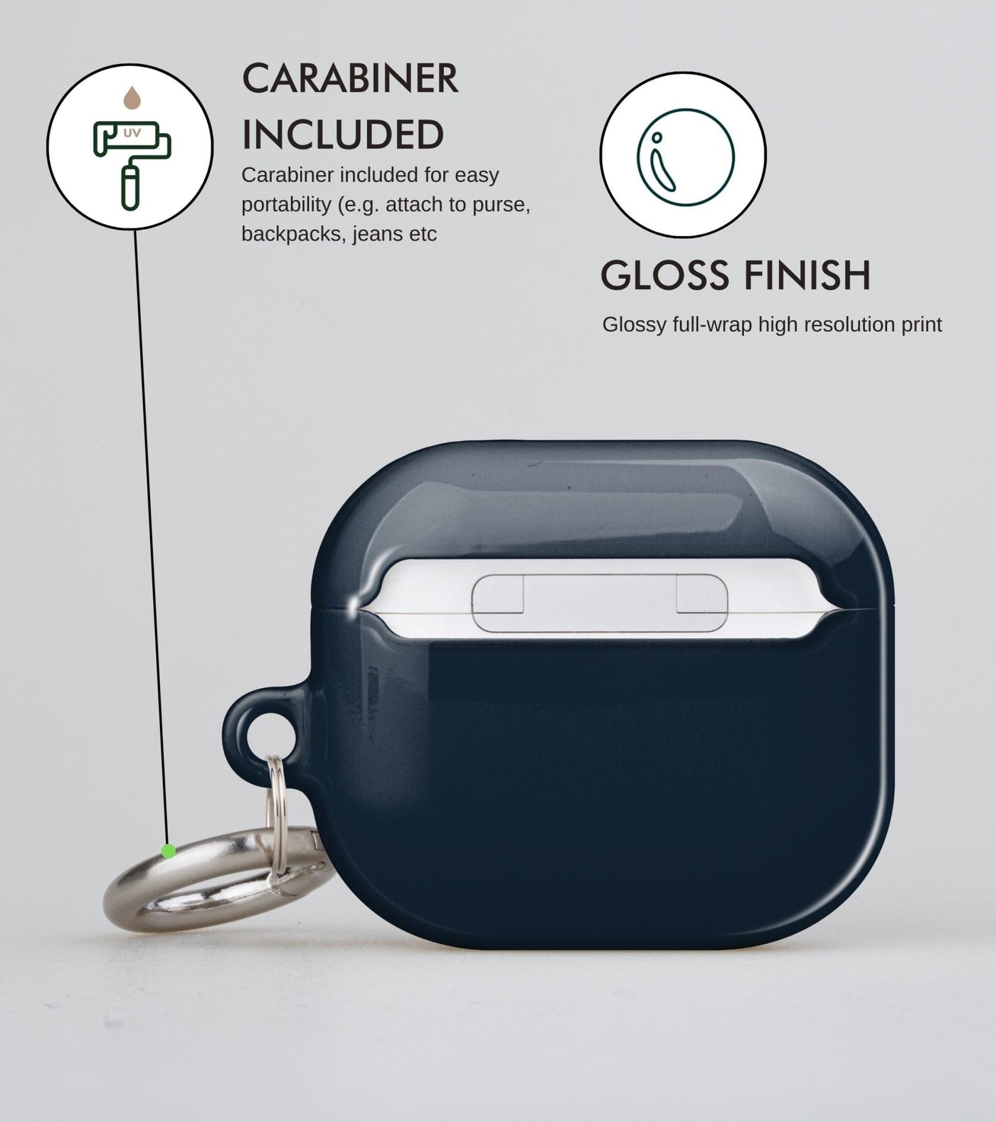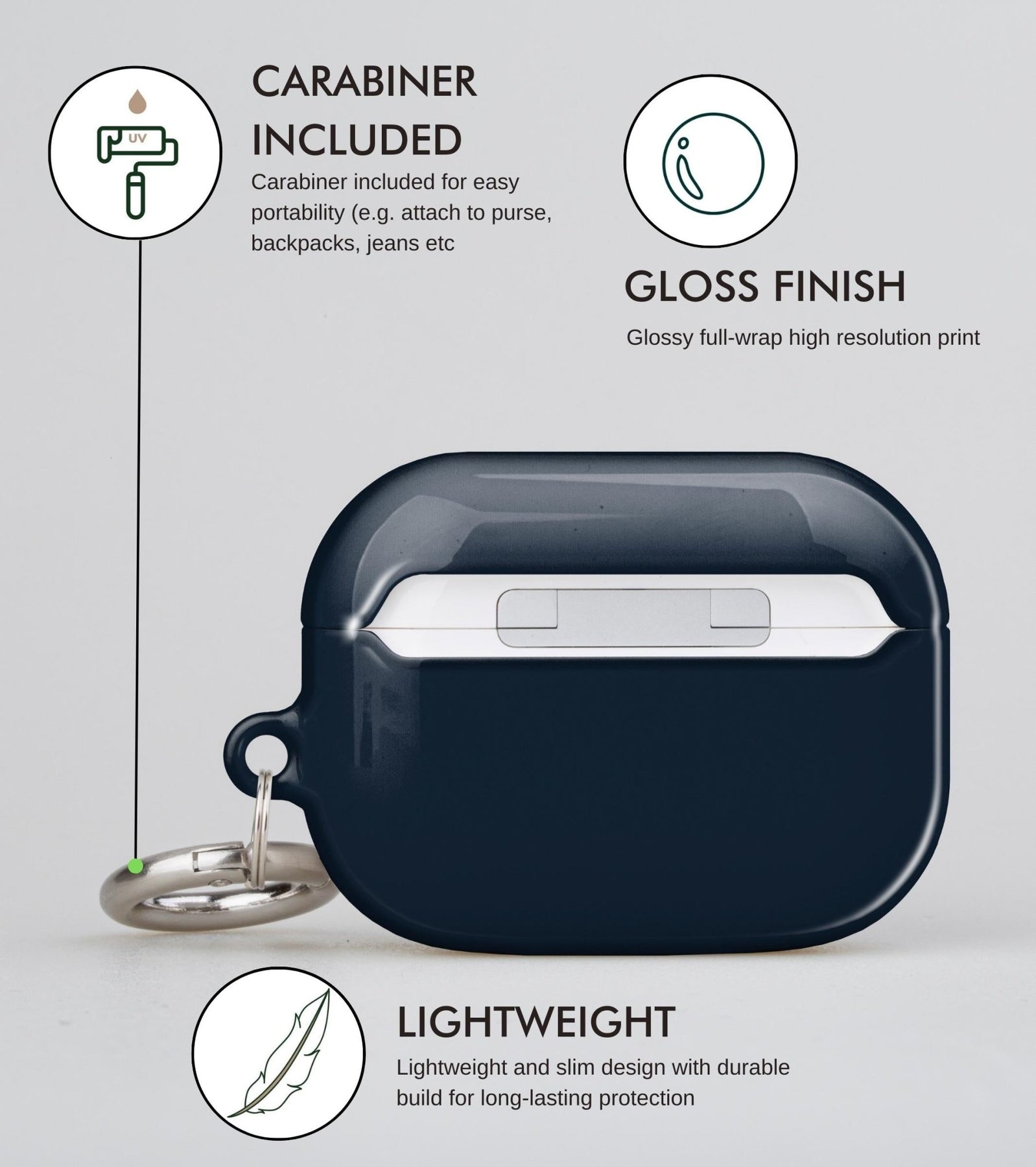 This case is compatible with all generations of AirPods and is crafted from eco-friendly and protective polycarbonate. It comes in a vibrant gloss finish along with a ring carabiner to ensure your AirPods will always remain within your reach.