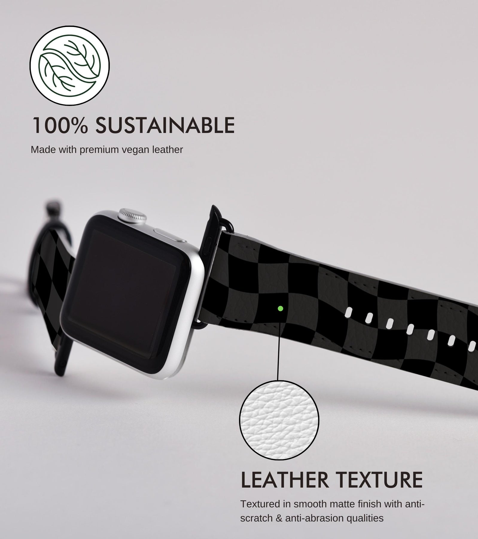 Whereas our vegan leather Apple watchbands are printed using a special cold UV Printing technique which results in subtle matte leather finish.