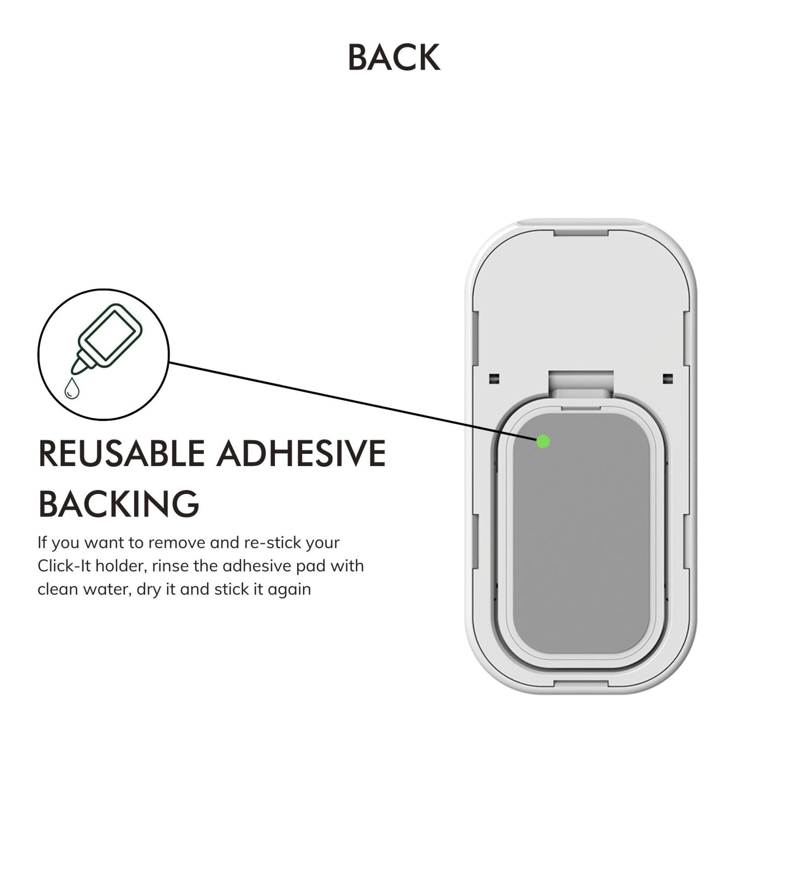 - Has a reusable adhesive backing i.e. if you want to remove and re-stick your Click-It holder, rinse the adhesive pad with clean water, dry it and stick it again
